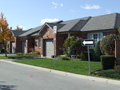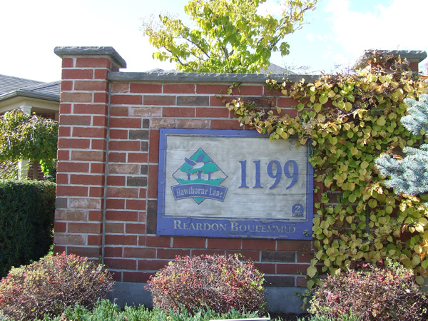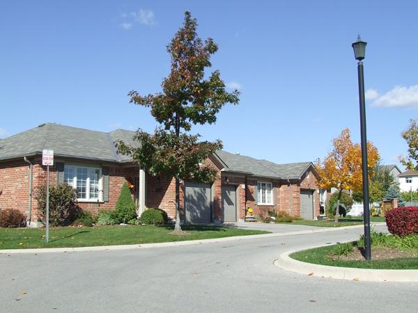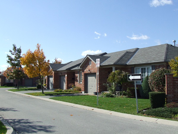 “Z Group” built. A white picket fence greets you at the street. The one floor models are 1,080 square feet with two bedrooms and the two storey units have three bedrooms and 1,123 square feet. All have single car garages, speckled brown brick, brown shingles, taupe coloured garage doors and siding, mostly one step front entrances. Quiet living in a maturing neighbourhood. “Meadow Gate Park” is five blocks away to the south and the “City Wide Sports Park” on the north side of Commissioners Road East is just slightly further away to the northwest.