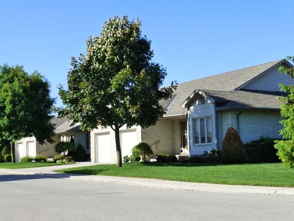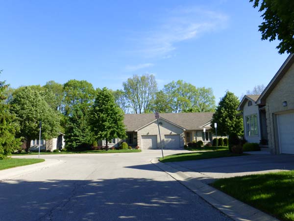 Sand coloured brick, taupe trim, some pale beige siding and light brown shingles. Two entrances into this complex. All units have single car garages and asphalt driveways. Adequate visitors parking and an interim gazebo area great for meeting your neighbours.