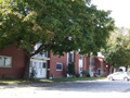 All brick exteriors. The brick colour is orange/red and the siding is a light yellow colour. Tan shingles.