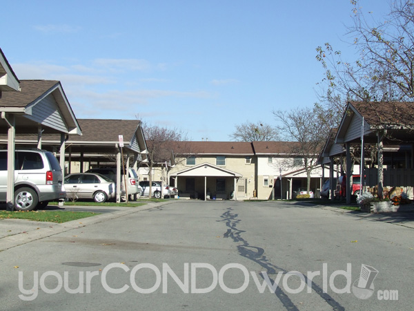 What's the difference between Phase I units and Phase II units ( which are the ones on the north side). One difference is the brick colours, one is red and one is yellow and one complex has much larger lower level front windows on the wall at the rear of the carport. Sliding glass doors to rear patio areas or to raised decks. One car parking and an average visitors parking arrangement. This is the only carport style complex in this area, they are more common in the Whiteoaks and Pond Mills areas.