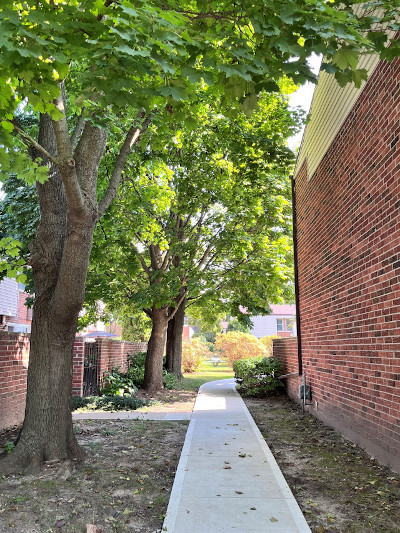 Two side-by-side townhouse projects of different designs sharing the same brick colouring. These units are now in the fifty-year-old age range making them the oldest condos in this part of the city. They enjoy age appropriate landscapings.