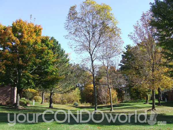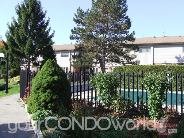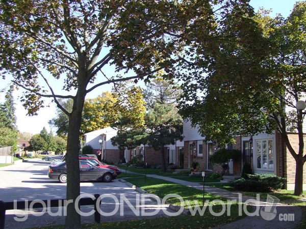 An older Byron condo complex in a very central location. Older in a nice way. Eleven clusters in total with cluster sizes varying from three to eleven units. Large front lower windows. These units are staggered in design within each cluster to offer a visual relief. This complex sits on a large 5.4 acre parcel of land. An unassuming entranceway flanked by single family houses on both sides. A Tim Horton's is only two doors away to the east. These units have speckled brown bricking with a slight orange hue, brown shingles and light tan trim. They have rear doors to fenced rear courtyards. This complex has a tennis court and an outdoor pool. There is a small rear parkette area and a rear seldomly used basketall hoop. No basketball playing after dusk. Three sets of speed bumps that you can avoid by driving around them. A library is just across the street and down a few doors. A public grade school abut the property to the north-west.