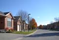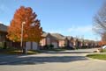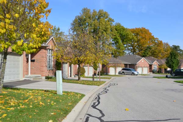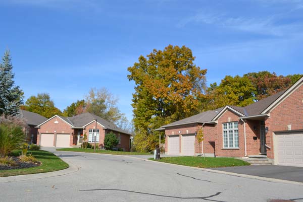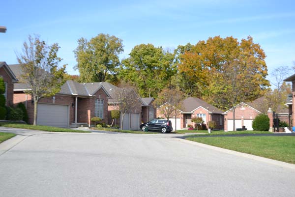 Brown brick, brown shingles. Peach and tan coloured garage doors, soffits, and fascia. These are detached units. Unit sizes of 1100, 1200, 1385 and 1475 sq. ft. Covered front entrances, some units have covered front porches, and a small number of units have open front sitting areas with brick privacy walls. Nine-foot ceilings on the main. A very small number of units have lower-level walkouts.