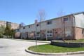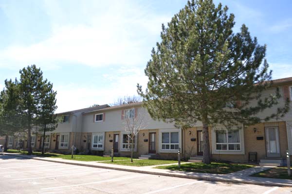 Three clusters of ten, one cluster of nine, eight and seven. All face onto one laneway that curves to the north west when you drive in. These are two storey three bedroom units in the 1,059, 1,156, 1,203 sq. ft. range. Sand coloured brick with tan trim and brown shingles. All that is, except one front cluster that has pale red brick and peach coloured siding.