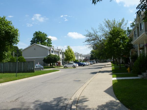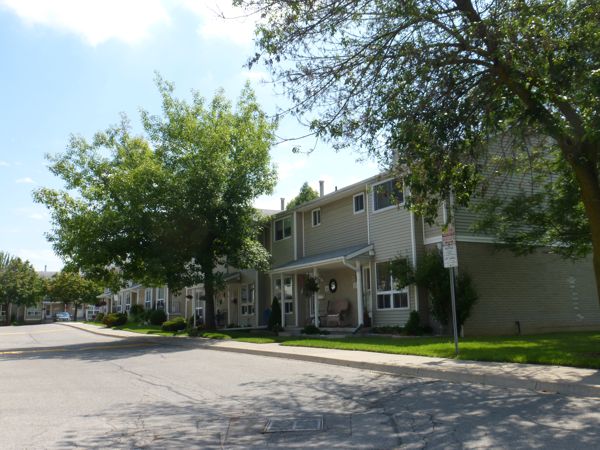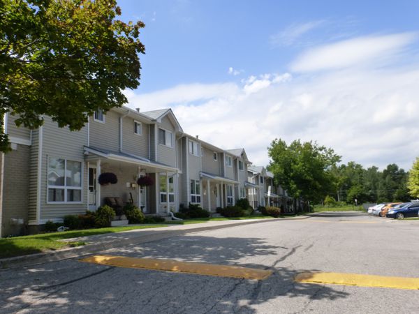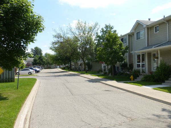 Three clusters of four units and one cluster each of five, six, and seven units back onto the "Thompson Ravine". Grey brick, grey siding and shingles, and white trim. Small covered front sitting areas. Three known unit sizes are 990, 1260 and 1300 square feet. These are three-bedroom units with condo fees going into 2022 somewhere in the $220.00 per month range.