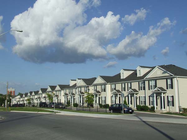 "Domus Built". Purpose-built, three plus two bedroom units built for rental purposes and owned mainly by investors. Built with one block of 2 units, two blocks of three units, four blocks of five units and one block of six units. Note that they are all vinyl exteriors with an absence of rear decks. Known unit sizes of 1275, 1280, 1300 and 1386 sq. ft. Each unit has a rear door with primitive wooden steps leading down to the ground level.