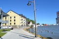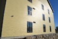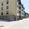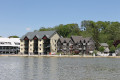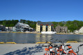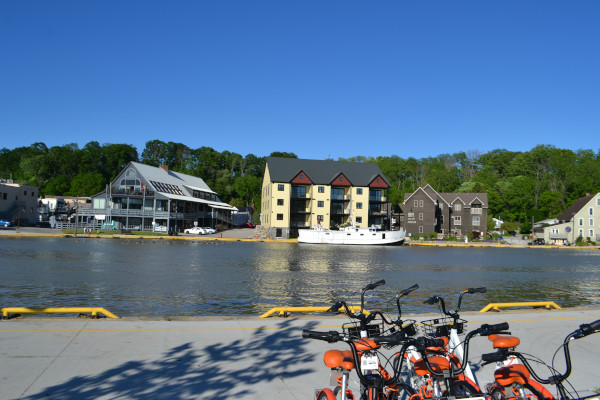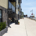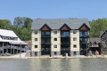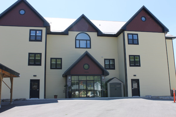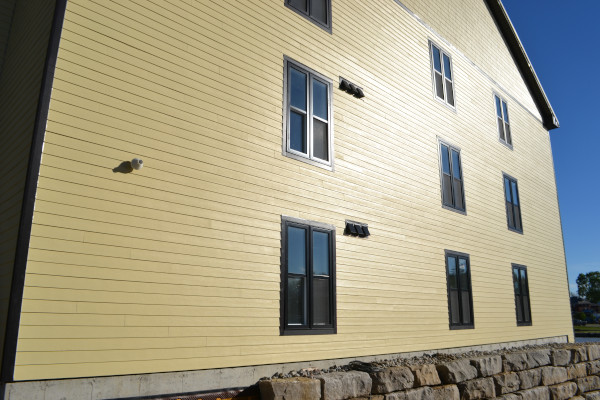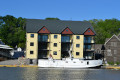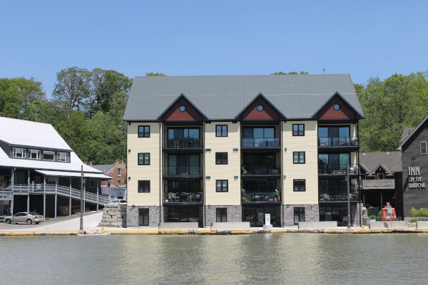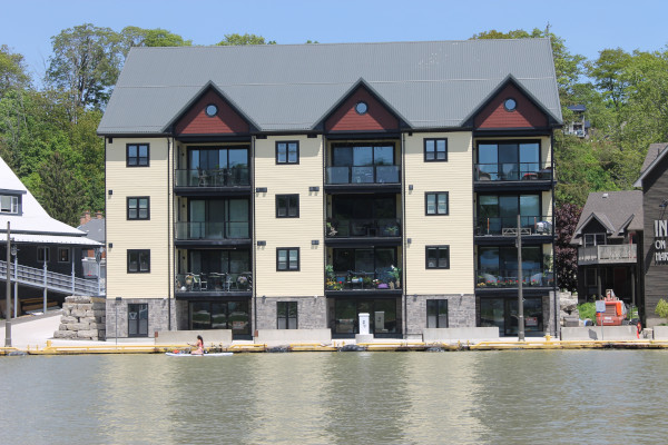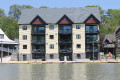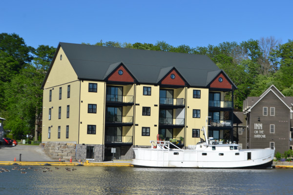 Also new on the east side of the river next to the "Inn on the Harbour" is a three storey, rather large yellow coloured condo building. It has three levels facing the street and an additional partial lower level at the rear facing the harbour. Yellow siding, some partial lower level exterior stone siding and a metal roof.