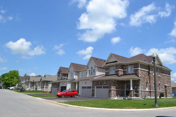 This street is in the heart of phase one of "Senator Homes'" new subdivision called "Havelock Corners" which is on the north side of the "Pittock Conservation Area". This street looks a little bit different in that twenty units of two storey units are built in five clusters of four units each. Also on this street in the middle of two clusters is a cluster of one floor units. These one floor units copy the design style of all of the units built to the immediate east on Baldwin Crescent. Does this arrangement look out of place? You decide.