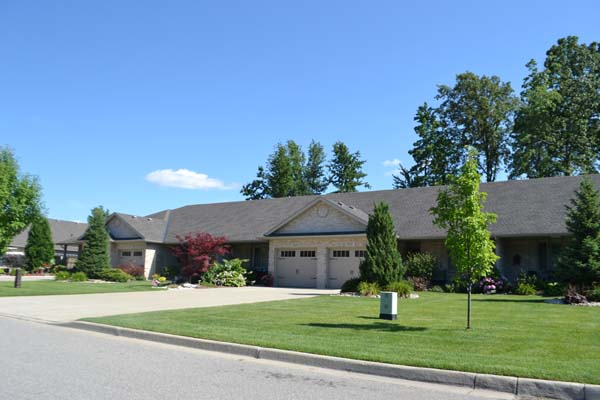 Here you will find clusters of two, four and six units. These are one floor units with light frosted brown brick, brown shingles, high pitched rooflines, tan coloured garage doors and covered front porches. Also note the one step front entrances and the nice setbacks from the street.