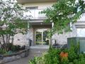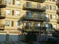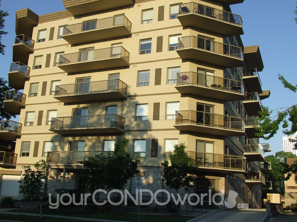 Light speckled brown brick on the main level and light coloured upper stucco exterior. A pillared front entranceway. An easy access front ground level parking garage and large front upper glass sided balconies and angular glass sided corner balconies. Side level views on the lower levels are of neighbouring old houses. We are, after all, talking about core downtown living. In this building there are three condo units on the main floor, and eight units on each of the 2nd to 6th levels. Nine foot ceilings. These units have bright, open concept interiors.