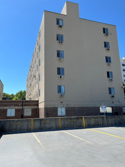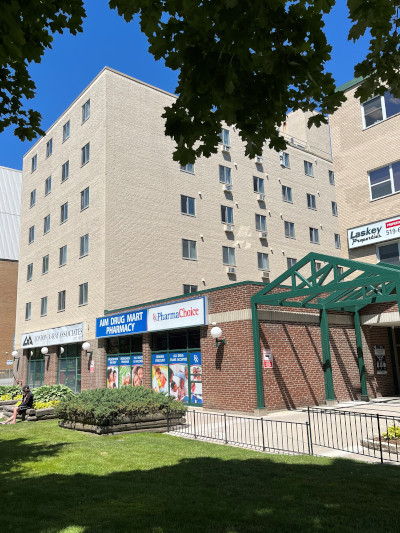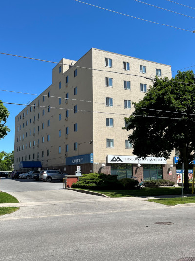 Brown brick on the main floor and recently painted upper brick in the colour of beige. A blue coloured covered side entranceway. There are medical offices on the main level and a four storey building attached to it in the eastern side. This building features a party room and a rooftop patio. There are nine units per floor on the second to sixth floor and one unit on the seventh floor. Laundry room is on the 2nd and 4th levels and a locker room on the fifth floor. A mix of one and two bedroom units. Known one bedroom sizes are 481; 627 and 687 square feet and two bedroom units are 621; 700; 800 and 810 square feet. There are window air conditioner sleeves. Two known condo fees for a two-bedroom unit in 2023 are $688.00 and $714.00 per month. The condo fees include things like heat, hydro, roof, doors, windows, water and exterior maintenance. In the past, this building had a number of special assessments. Assigned parking and visitors parking.