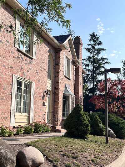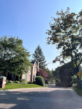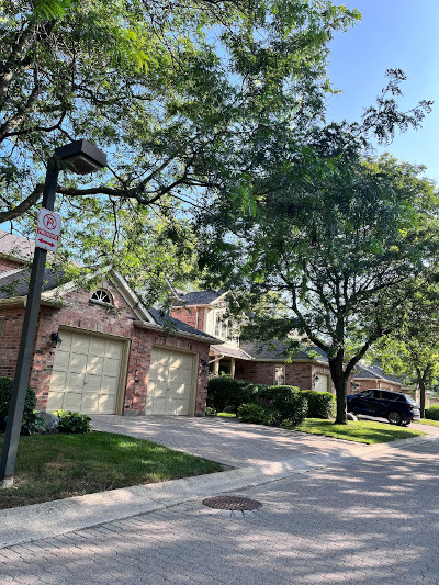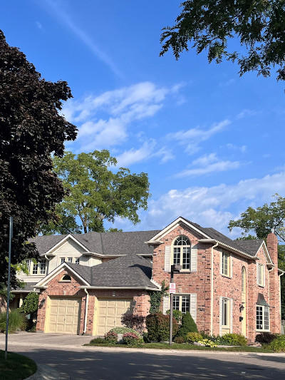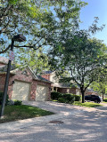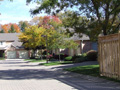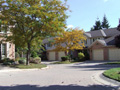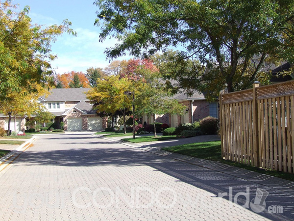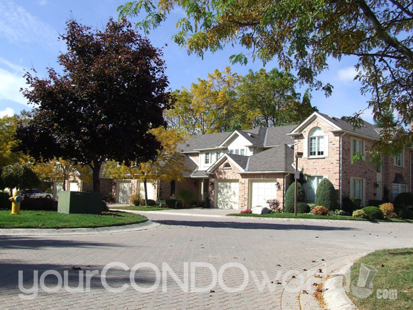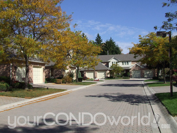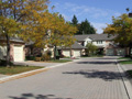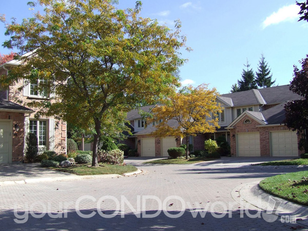 Two clusters of four, three clusters of six units and one cluster of eight. Speckled brown brick, light yellow/cream siding, eaves and facia, greyish/black shingles. Four units face onto Maitland. Single car garages with large side garage windows. Copper gables on some end units. Small covered front porches, mature trees on site, attractive landscaping, a sprinkling of “boulders” onsite. Limited on site parking with street parking on Maitland Street for two hours on Monday – Saturday from 8:00 a.m. to 6:00 p.m.