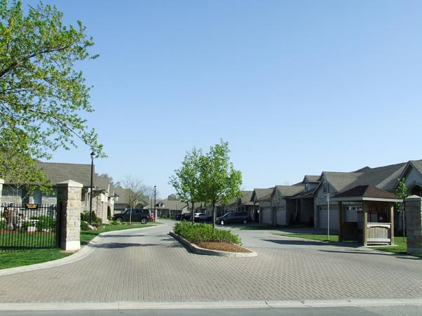 "Birchwood Homes" built. "Birchwood Homes" has been very busy in the last few years building in the Lambeth area of south London. Stone pillars and front brick roadwork that looks great as you drive in. Brown and sand coloured brick, tan trim, covered front entrances, some stucco highlights and block driveways. The condo fees in 2024 are in the $390 per month range (this is a self-managed unit and the term used is maintenance fees).