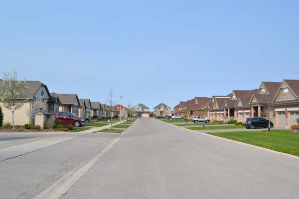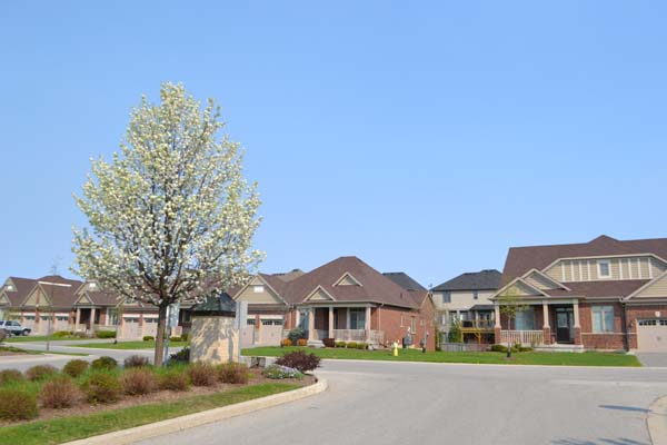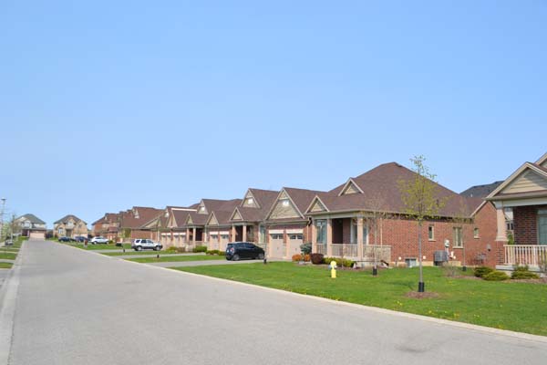 The one-floor models share the same brick colouring and have peach coloured siding and brown shingles. One cluster of four and one cluster of five units. Covered front porches, some false upper dormers and interesting roof designs. Interlocking brick driveways, double-car garages and double deep driveways. One known size of a one floor model is 1838 sq. ft. of above ground living space.