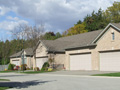 Light brown speckled bricking, tan coloured garage doors, brown shingles and taupe fascia and trim. There is nice spacing between these clusters. All these units have double car garages.
