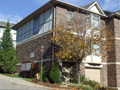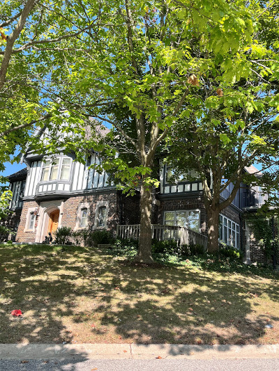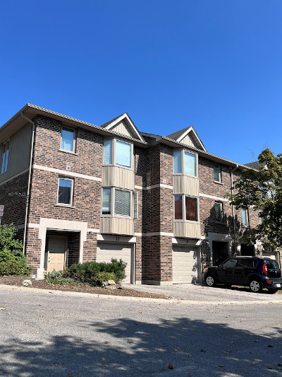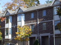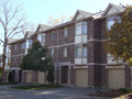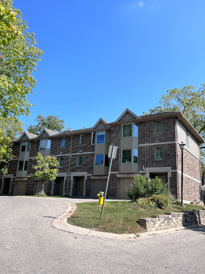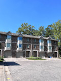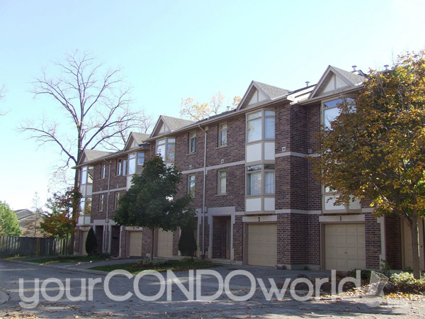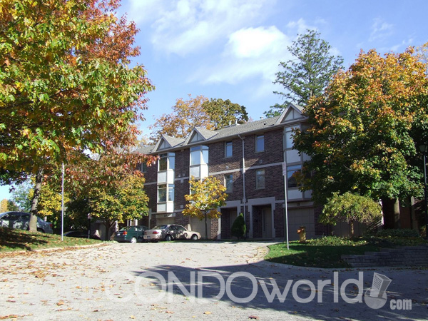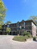 This complex converted a graceful Victorian styled two-storey home with brown brick and a cedar shake roof into three condo units and added two detached garages to accommodate three vehicles. Then added was one cluster of four units, four clusters of five units and three clusters of six units. The units on the north side have checkered brown brick grey upper siding and trim while the units on the south side and the one cluster behind the Victorian structure have the same brown brick with beige coloured upper siding and garage doors. This is a subtle difference which doesn't detract from the charm of the complex.