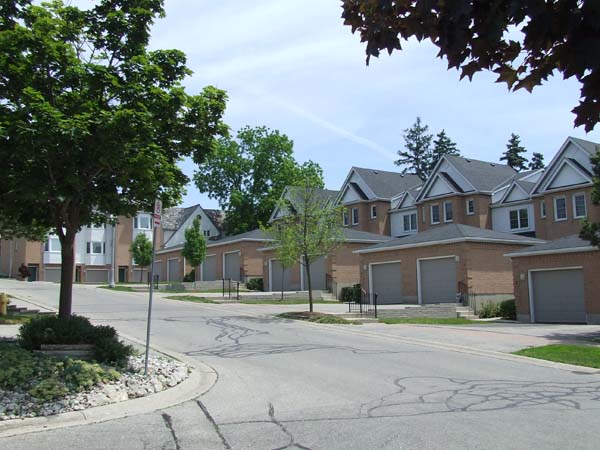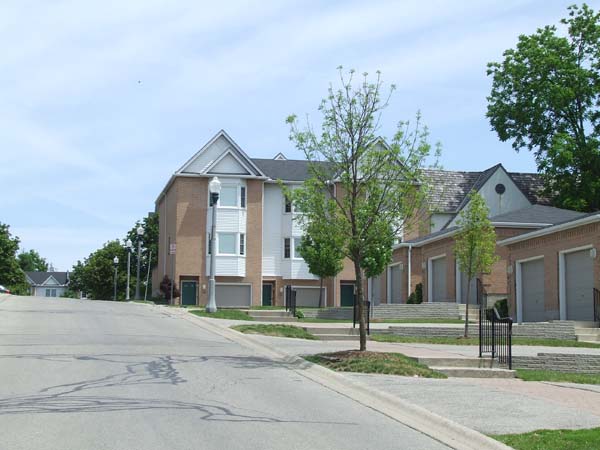 The remaining sixty-two units are two or three level, with orange/brown brick, light tan garage doors, white trim and black shingles. Most units, except for one cluster in the rear (units 16-22) have detached front garages, each one shared by two units (two separate single garage doors). Known unit sizes are 1400 and 1540 sq. ft. When listed for sale the reported number of bedrooms are 2+1, 3, 3+1, 4 and 5. Two known condo fees in 2024 on the two bedroom units are in the $377.00 and $392.00 per month price range.