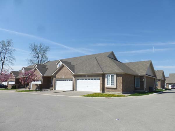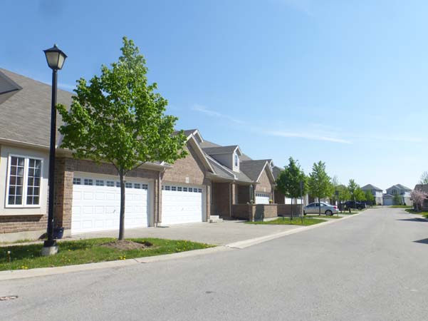 Five clusters of five units each and two clusters of four units. One cluster of five units faces the street and two rear clusters of four units each back onto Adelaide Street North. Brown brick, tan siding, white garage doors and window trim. Block driveways, false upper dormer windows, raised rear decks and the end units have side front entrances. These are one floor units with a slightly pitched roofline. Some units have small bricked in front sitting areas.
