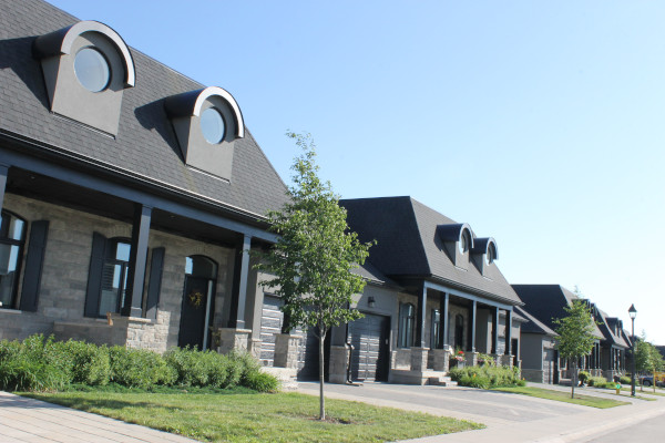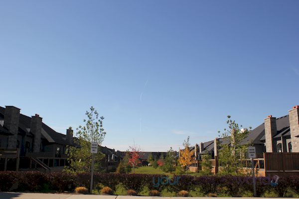 Stone and stucco exteriors, black trim and garage doors, black shingles and high pitched upper mansard rooflines. A mix of single and double-car garages. These units have upper lofts consisting of one bedroom and a three piece bedroom (over 700 sq. ft.)