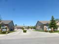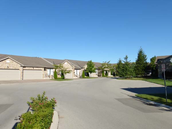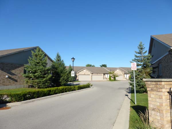 "Auburn Homes" built. This project is noticeably smaller in size and slightly older than the neighbouring "Auburn" built project next door. It's site size is 5.77 acres with side and rear fencing on Blackwater Road and Adelaide St North. Speckled yellow bricking and a frosted yellow/beige bricking. Tan siding and brown shingles. We note also the intricacies of the brickwork found here, particularly around its front garage doors on some units.