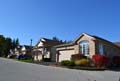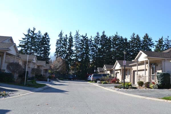These look like one floor ranch and bungalow detached units, however, upon closer inspection, one style that looks like a one floor bungalow is actually a four level backsplit. Single or double car garages, covered front porches and rear decks. One design feature which is somewhat unusual is the liberal use of exterior siding. In most projects this feature would be a negative however with this complex it simply adds a touch of simplicity to the design. Brown bricking, tan coloured siding, tan beige trim, peach coloured garage doors, asphalt driveways, covered front entrances and some covered front porches.