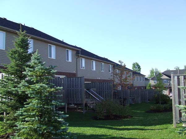These are two storey single car garage units with known unit sizes of 1,200; 1,230 and 1,260 square feet. Single car asphalt driveways, speckled rust coloured brick, black shingles, taupe grey green garage doors and siding, raised rear decks, peaked upper front rooflines and slightly protruding front garages. These are three bedroom units built with unfinished basements.