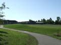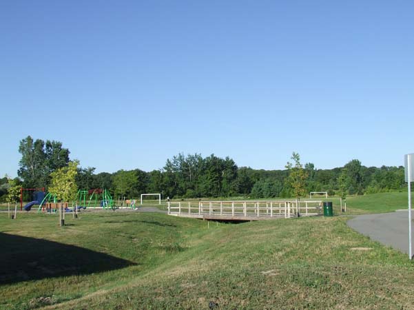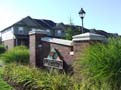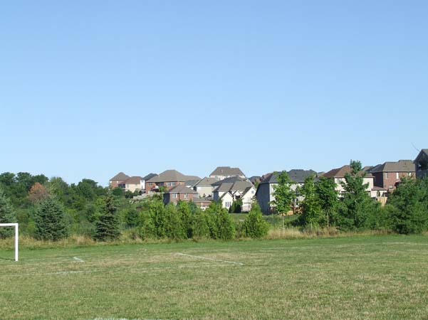 Two entrances. Slightly downward elevation levels as you first drive in. A covered mailbox area and attractive tall coach lights. Ten clusters of four units, one cluster of ten units and three clusters of six units. Like with the condo project next door to the east, the rear units in this project backs onto a high berm and beyond that a set of railway tracks. Then to the immediate west is Whetherfield Park with a playground area.