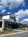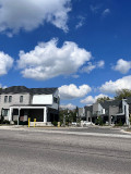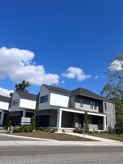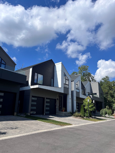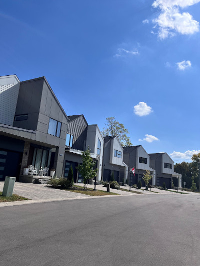 "Modernist" in design style. Grey siding with white highlights, a limited use of grey brick on some units, black painted garage doors, black shingles, black window trim. Other siding colours include black, tan, and cream. A small number of units have upper front glass sided balconies.