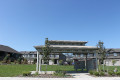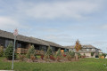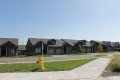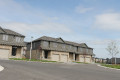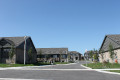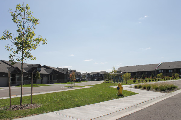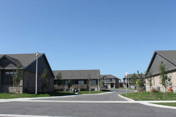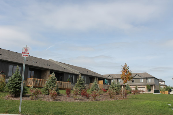 The five clusters facing the street are one floor units with block driveways. Covered pillared front entrances with a lower light brown skirt of stone, tan trim, taupe upper hardboard siding, brown shingles and side walls of brown brick. False upper front dormers. These units have single car garages and raised partially enclosed rear decks. Four additional interior clusters of this same style sit behind these units and one additional cluster sits in an open centre area.