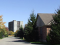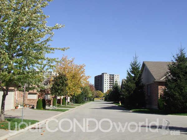 These are one floor units with double rear garages in the 1,145, 1147, 1155, 1200, 1210, 1238 and 1269 square feet range. A mix of 1 + 1 bedroom, 2+1 bedroom and 3 bedroom units while two bedrooms are actual 1 bedroom plus den. A spotted brown brick exterior, brown shingles, tan coloured siding and tan coloured garage doors, white trim. Some models have bricked-in front courtyards and others do not. Brick driveways. Some models have partially covered rear decks. One cluster of units backing onto the street has lower-level walkouts.