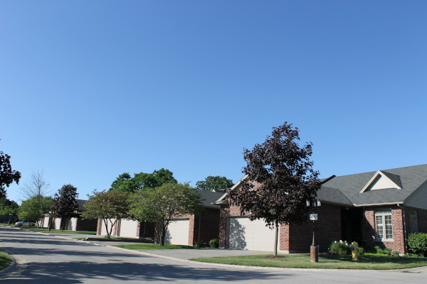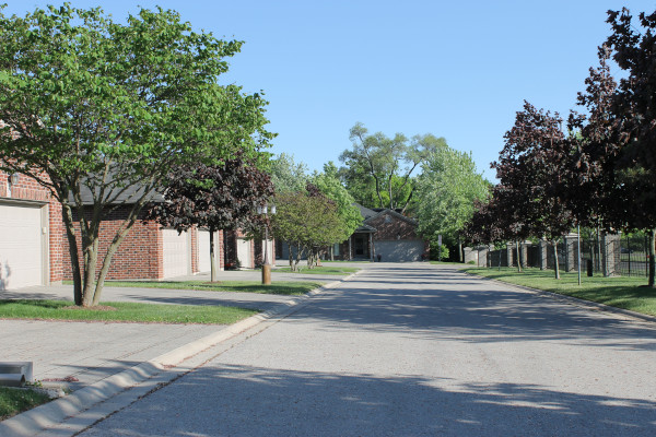 Speckled brown brick with black shingles and tan-cream coloured upper siding. Covered front entrances, some pillared, block driveways. Units 1-9 and units 11-21 are a different style of units than units 23-69. These are the units on the right hand side or the south side when you first drive into the complex. The 1-9, 11-21 clusters (two clusters of five units each) there are four end units with double car garages while all of the interior units have single car garages. These units have partially covered rear deck and lower level walkouts. Then the remainder of the complex consists of six clusters of four units each, all with double car garages which extend out in front of each unit.