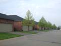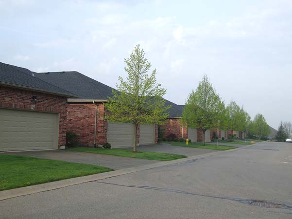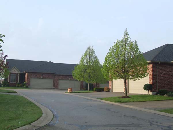 potted brown brick exteriors, tan trim, black shingles. Some front pillars and some interesting front trellis designs. Some units have lower walkouts and some have covered rear decks. Some raised rear decking's, block driveways. Built with nine foot ceilings and vaulted ceilings in the great room. Unit sizes here are 1,425; 1,445 and 1,500 square feet.