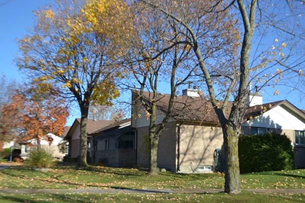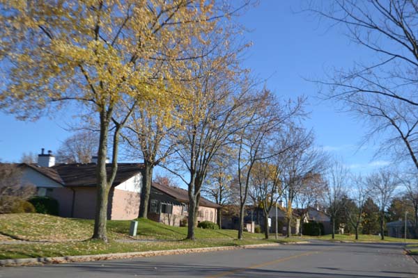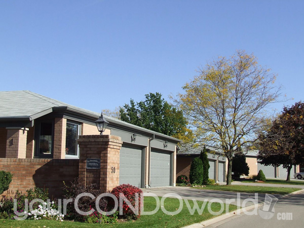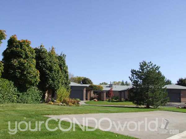 Let's describe #50 Fiddlers Green, the complex with the largest number of one-floor condos. Brown-reddish brick, grey shingles, grey garages, and trim. Some units have front courtyards, some have side front entrances. Twenty-two clusters with 3 clusters of 3 and the remainer 4, all have double car garages. Wonderful landscaping, maturing trees, attractive curvatures to the laneways. Various areas of visitors parking. Over the years many units have had extensive upgrades.