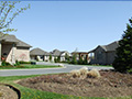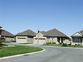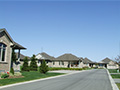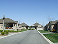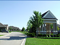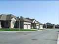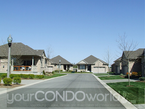 Brown brick, white siding, black shingles. Paving block driveways. Some pillared front stonework. Covered rear decks. Some covered front decks, a centre area of greenery. A strong bold front entranceway with a community mailbox and a feeling of spaciousness. "Hayhoe" builds worry free living.