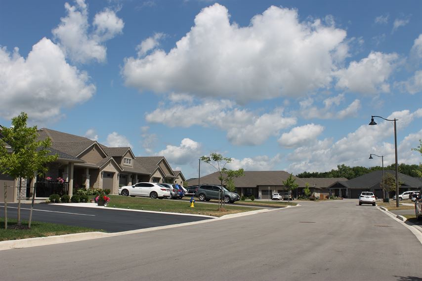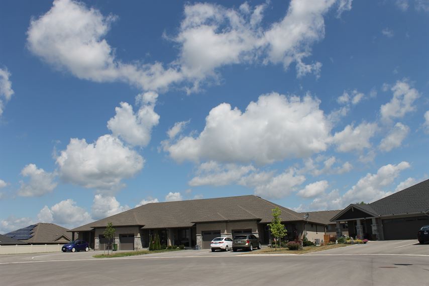 Nine clusters of Hayhoe one floors built mostly in clusters of four. Four known unit sizes are 1,132; 1225, 1254 and 1132 sq ft. Typical lot widths are 26.5 ft, 27 or wider frontages with some additional end unit or corner unit numbers as 35, 36, 47 and 56 ft. The road does have some slight curves to it. Arbor Trail runs parallel to one small section of Peach Tree Blvd. off of Caroline Crescent. The units at the rear of the street back onto the rear of the homes on the south side of Empire Parkway. A walkway on the east side of the street takes you to the "Orchard Park" trail.