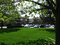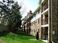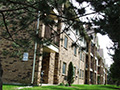 A speckled brown brick exterior with some upper level patches of cream coloured siding. Brown shingles. Covered balconies on the second and third level and covered main level patios with direct access to green space. Wall sleeves for window air conditioners. Controlled entry, elevators and an exercise room. These units are electric heat with a gas fireplace.