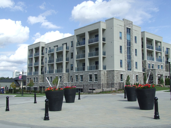Light brown main level bricking with some highlight bricking around some of the second level windows. Upper coloured tan stucco. Some open third level balconies and some covered. These are glass sided balconies. Tinted windows. Some first level units actually have their bedrooms on the second level above it. The entranceway to the underground parking lot, which services both buildings, has an entranceway flush with the outside ground level.